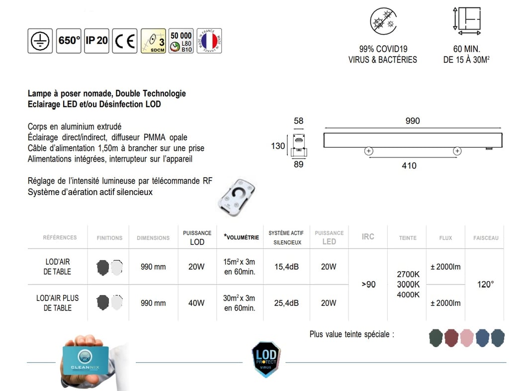 LOD'AIR table + : Led: 20 W − Lod: 40 W − 30 M²
